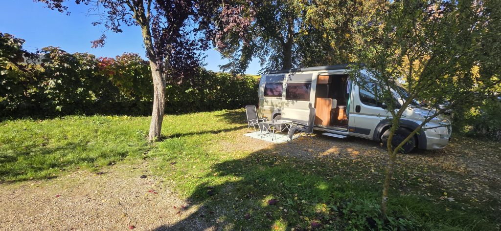 Unser Stellplatz: der Camping Les Trois Châteaux. Ein kleiner, ruhiger Platz mit viel Grün, direkt am Storchenpark und nur wenige Schritte vom Dorfzentrum entfernt.