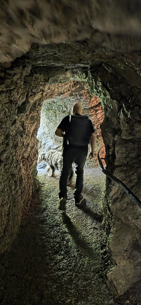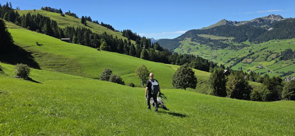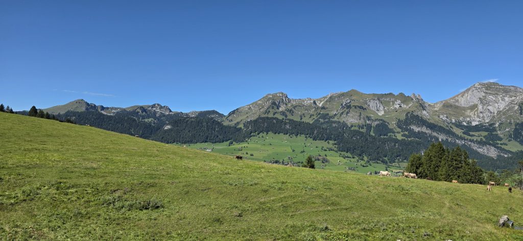 Eine junge Frau überholte uns flott, kam später wieder zurück und wir ahnten schon, irgendwas stimmt nicht. Der Wanderweg war durch einen elektrischen Kuhzaun unterbrochen. Die Frau konnte unten durchschlüpfen, aber mit Taiga war das keine Option. Also suchten wir einen anderen Weg. Noch steiler, noch unebener. Und ja, wir hatten Turnschuhe an. Es war anstrengend, wir mussten aufpassen, nicht umzuknicken. Endlich fanden wir einen Zaun ohne Strom und konnten durchschlüpfen.