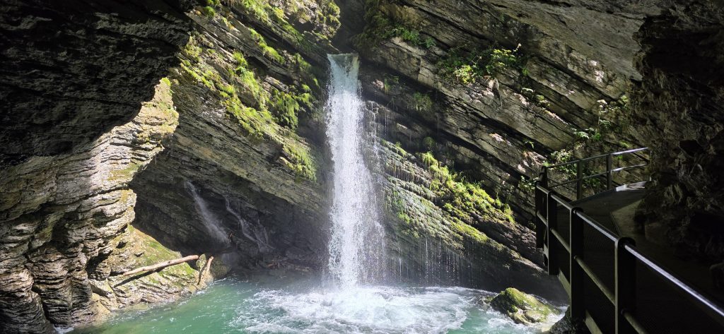 Unser Ziel war Unterwasser, ein charmantes Dorf am Fuss der Churfirsten. Von dort wollten wir zu den Thurwasserfällen spazieren. Ein kurzer, einfacher Weg von etwa zehn Minuten. Und tatsächlich, der Spaziergang war leicht, aber das Naturschauspiel am Ende hat uns tief beeindruckt. Die Wasserfälle stürzen mit einer Höhe von 23 Metern durch das enge Chämmerlitobel und sind über Stege und Plattformen wunderbar zu bestaunen. Unser Hund Tajga war natürlich mit dabei und hat den Ausflug genauso genossen wie wir.